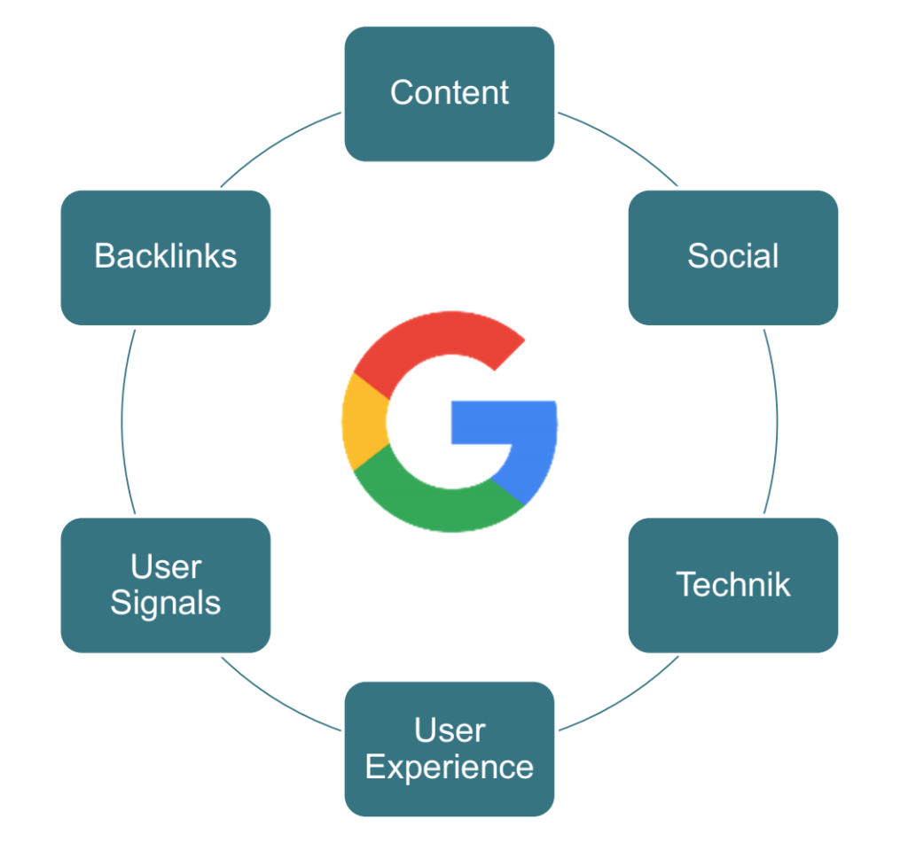 Eine schnelle, aber auch kostenintensive Möglichkeit ist das Schalten von Google Ads. Hierbei werden Werbeanzeigen nach einem Auktionsprinzip in den Suchergebnissen prominent platziert. Damit eine Webseite auch ohne bezahlte Verstärkung eine gute Sichtbarkeit in der organischen Suche erzielt, muss sie bis zu 200 Ranking-Faktoren erfüllen. Diese lassen sich in die folgenden sechs Kategorien unterteilen: