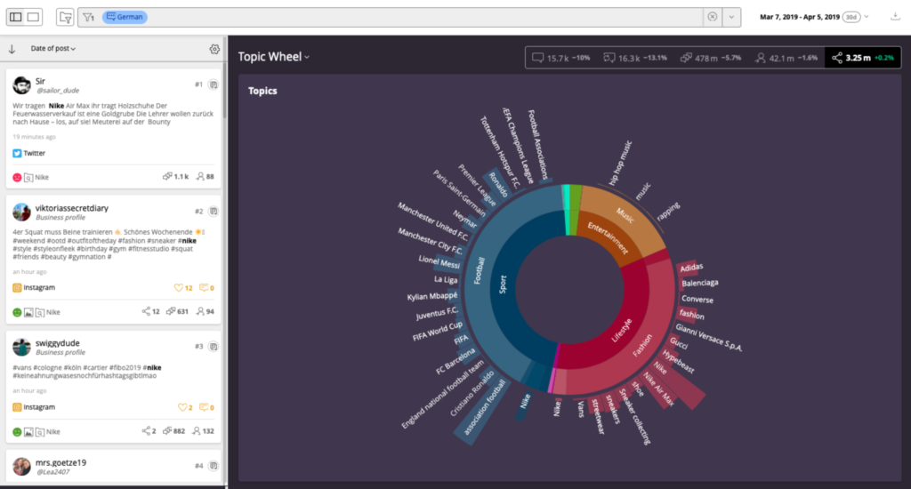 Das aufgeführte Beispiel ist ein Auszug aus Radarly und zeigt das Topic Wheel. Das ist eine Funktion, mit der sich erste Themen herauskristallisieren lassen.